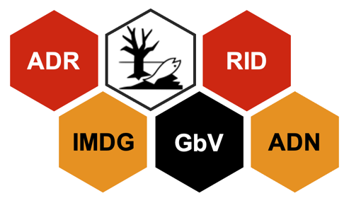 Diese Abkürzungen beziehen sich auf internationale Abkommen und Vorschriften für den Transport von Gefahrgut auf verschiedenen Verkehrswegen: ADR (Straße), RID (Schiene), ADN (Binnenschiff) und IMDG-Code (Seeschiff).